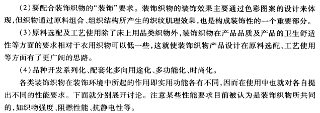室内装饰布料的有用功能主要是通过其品种设计来实现的。由于品种设计决策布料的外观风格与内在质地性能,因而其在装饰功能设计个也起着重要作用。布料的纹理效应很大程度上取决于布料的纺纱线原材料、组织与交错密切度。提花产品的花纹层次效果必须依赖于品种设计和工艺设计。这里,主要研究讨论各类装饰面料在有用功能上,应依托怎样的品种设计。