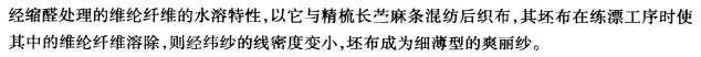 —些仿麻面料常用竹节花色纱织制。但没有麻面料竹节不均匀风格,必须经较重的树脂处理,才使手感硬挺,以形成麻的风格。