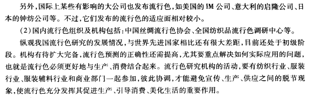 (2)不同地区的区别:国际流行色对世界各国的而料市场有着明显的指导作用,其影响是宏观性的。但对于不同国家及地区而言,则相对会有许多变幻,流行时间的先后、长短也有差别,而现代交通、通讯、贸易的进展。又会反过来冲击国际色彩潮流的趋向。