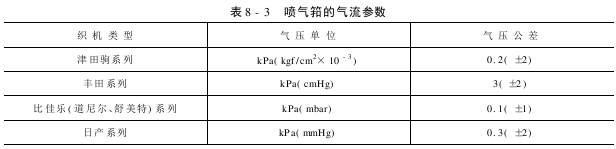 喷气筘的气流参数(气压值)是一项重要的技术指标,有喷气织机制造厂设定和纺织企业设定两种。一般是根据喷气筘型式结构的不同,织物纤维的不同及筘号的不同来设制,目前国际上通常使用的喷气筘气压值单位有4种,见表8-3。
